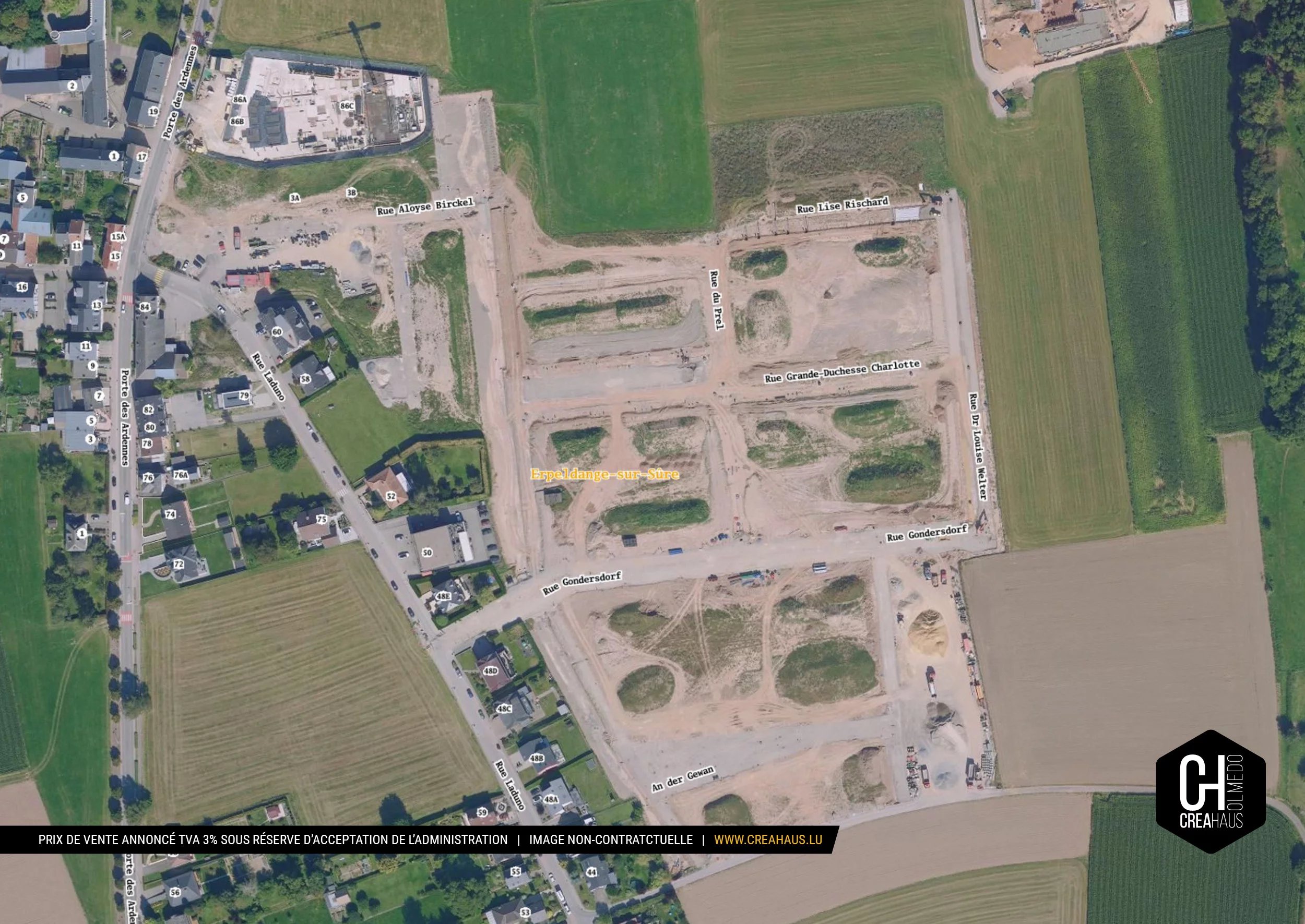 Creahaus is pleased to present the development « In der Mittelsten Gewann », ideally located in Erpeldange-sur-Sûre. The project includes several plots with construction contracts, ranging in size from 3.93 ares to 6.11 ares, intended for the construction of semi-detached houses, terraced houses, or semi-detached houses by garage.New house in future construction: a tailor-made project, designed for today and conceived for the future.